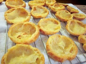 Bake for 15 minutes and then reduce the oven temperature to 350 degrees F (177 degrees C). Bake for a further 30 to40 minutesor until the shells are a nice amber color and when split, are dry inside. Turn the oven off and, with the oven door slightly ajar, let the shells dry out for a further 10 – 15 minutes. Remove from oven and let cool on a wire rack.