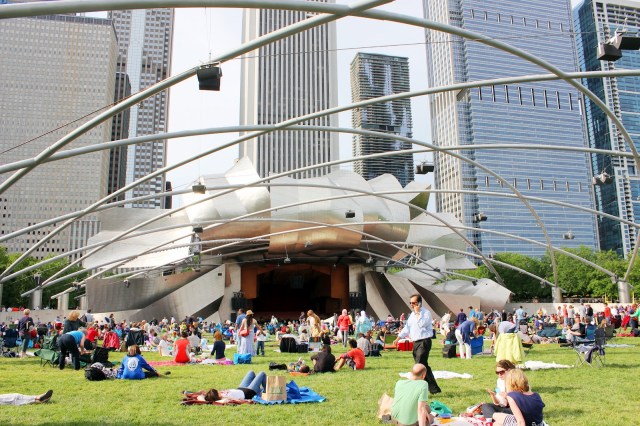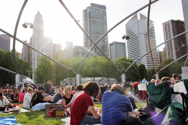 Today, Dottie and I partook in the opening of Grant Park Orchestra’s 2012 season with a free concert at the Jay Pritzker Pavilion in Millennium Park. We had our modest blanket with some cheese, fruit, and wine in plastic cups. But a quick look around and we knew that we had to step it up the next time.