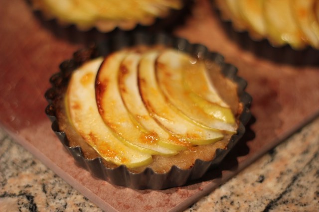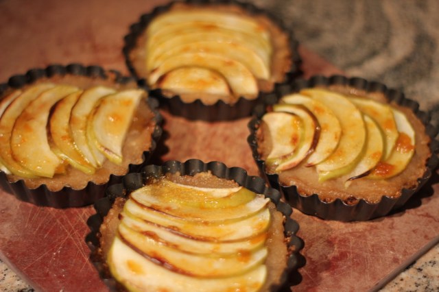 Layer the apple sauce in the partially baked tarts. Top with sliced apples and a sprinkling of sugar. Bake for another 10-12 minutes until the crust starts to come away from the sides. Since nuts burn easily, make sure to lower the oven temperature if necessary.