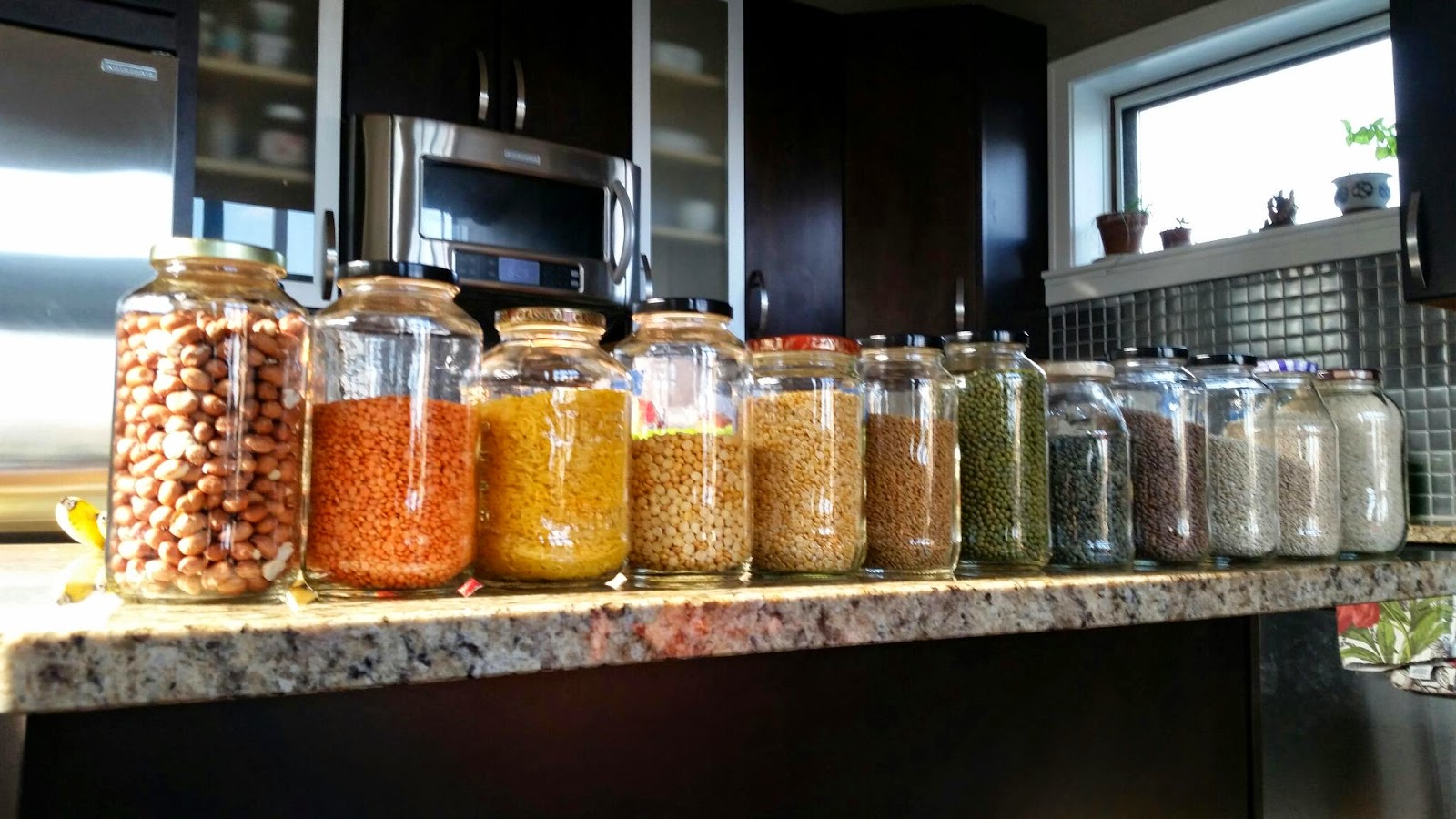 Once home, I laid out all the bags on the kitchen counter and noticed the beautiful color variations. I then got a sudden urge to display them like a rainbow in my pantry. I spent the next two hours taking off labels from old glass spaghetti jars so I might use them to display my loot. The process involved a deep soak in hot soapy water, some elbow grease and a scrapping tool. Once clean I let them dry in the sun for a while.