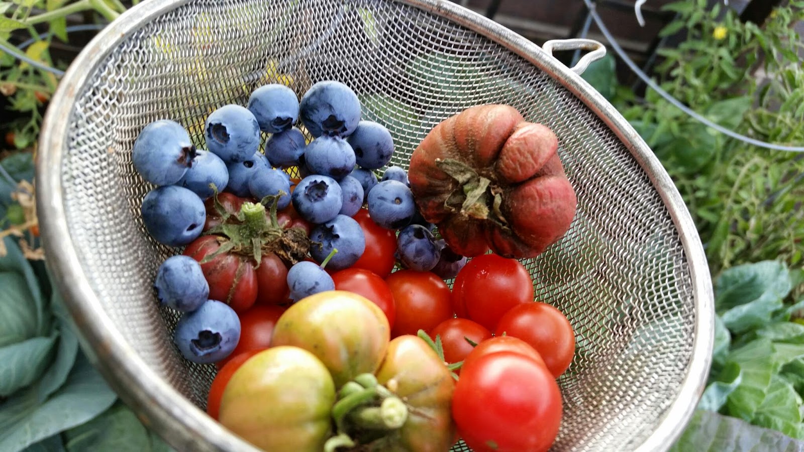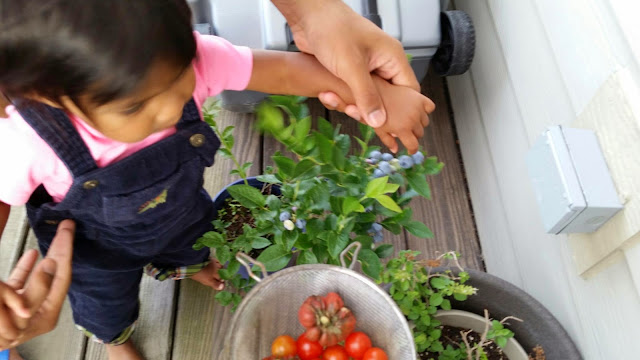 On Tuesday Asha helped her daddy pick the ripe blueberries and tomatoes on our balcony. She had her little overalls on too and I could have eaten her up!