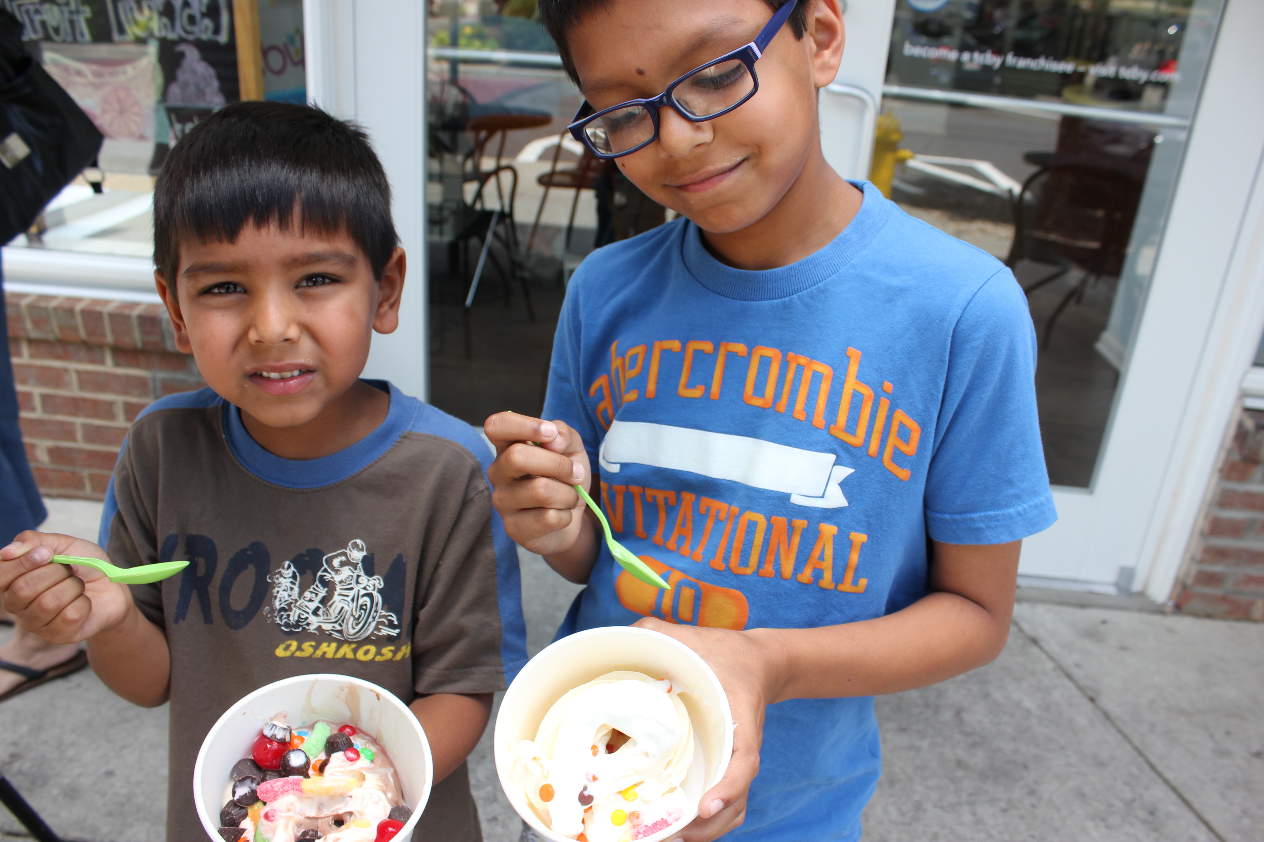 Eshaan and Aashrai eating ice cream at Birkdal Village