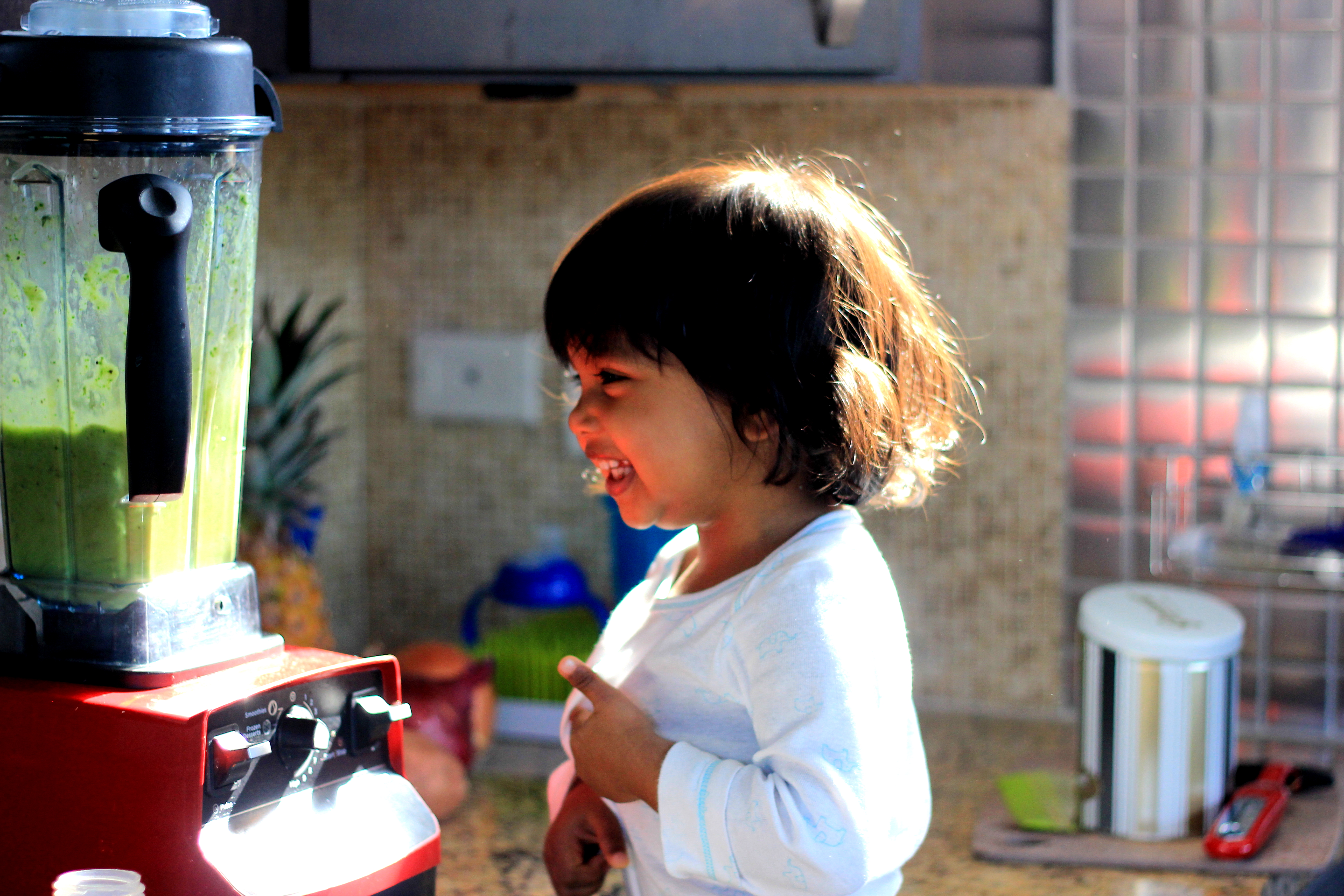 I am happy to say though that my Vitamix blender has been resurrected and in the recent few months I have found myself using it at least 3 to 4 times a week. As a bonus it has been a fun collaboration with Asha where we can pretend to be cooking together. She usually steps on her stool next to me and plucks the kale leaves or peels the banana or adds the vegetables and fruits I chopped in the blender. And of course she gets to turn it on and make the big “roooommmmm” noise. Lucky for me she also can hardly wait to drink the concoction.