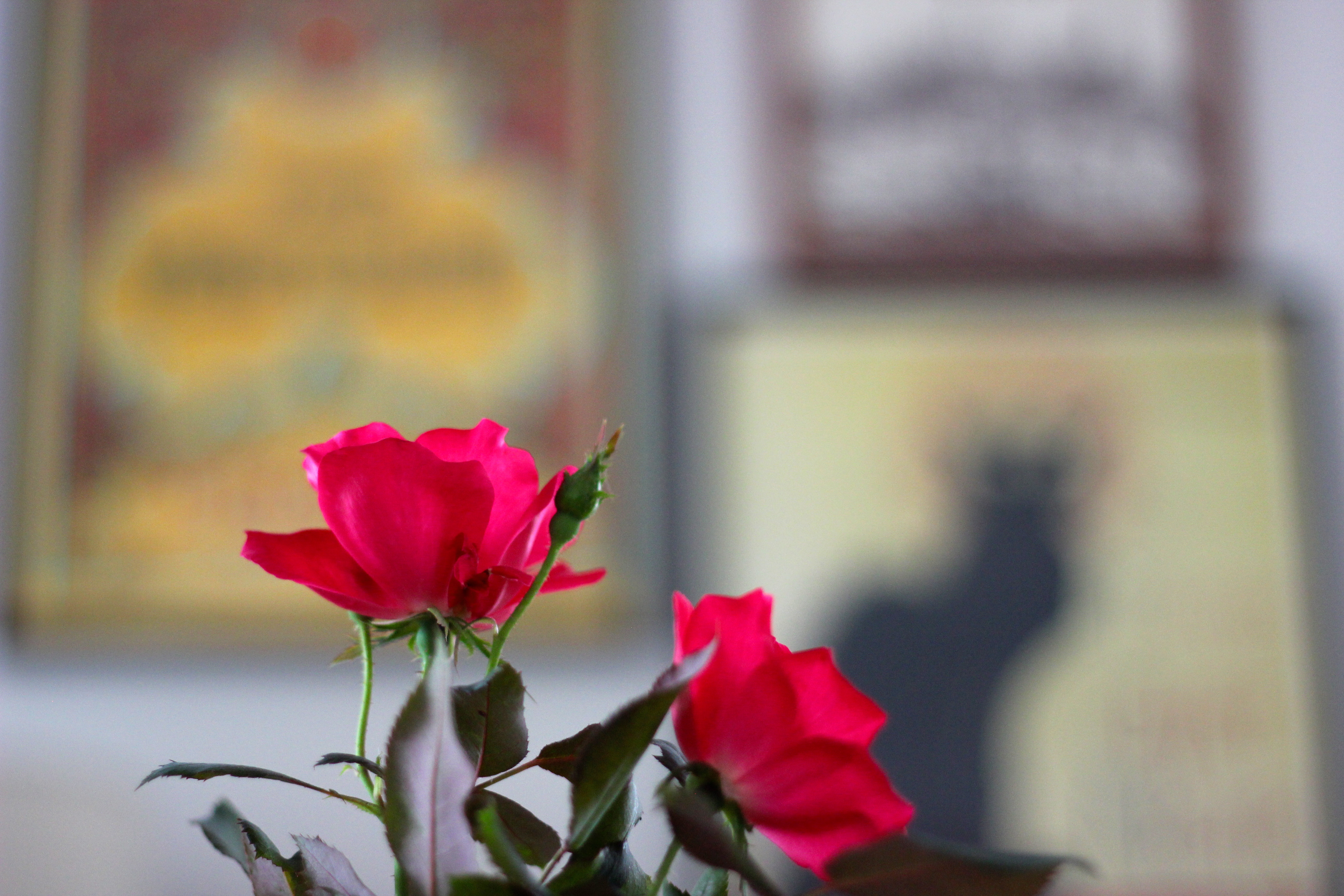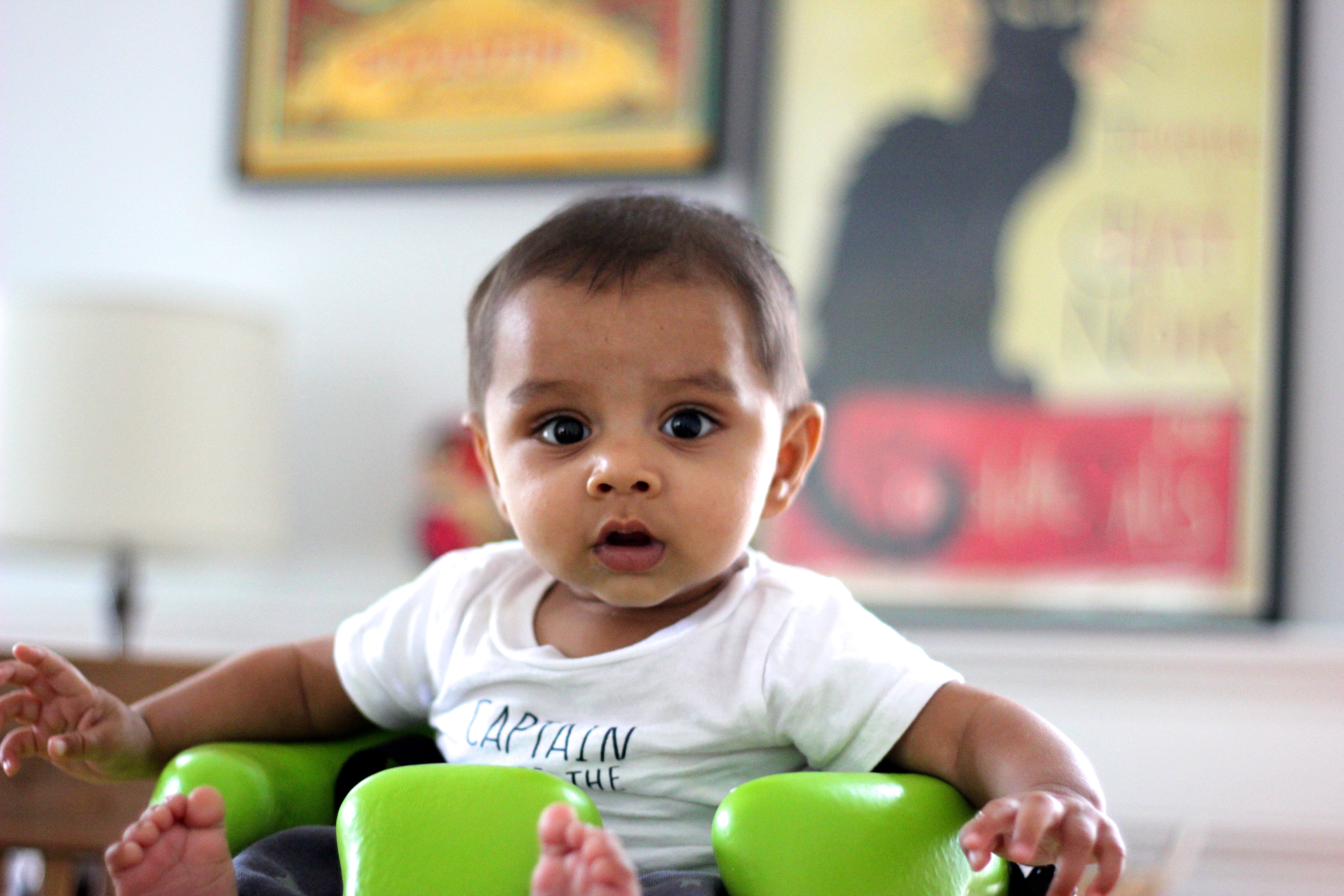 Here are some before and after pictures of the focus wall: The small Stockholm picture and the Vermouth picture are both framed kitchen towels. The Russian nesting dolls were a recent gift from my sister who was in St. Petersburg. Le Chat Noir has been with me for years and was rescued by Devang from the apartment garbage room. The lamp is thrifted from Chicago. The table is from Costco. Roses are from our garden. I couldn’t help but add this picture of Arjun who sat on his Bumbo and was the perfect design assistant.