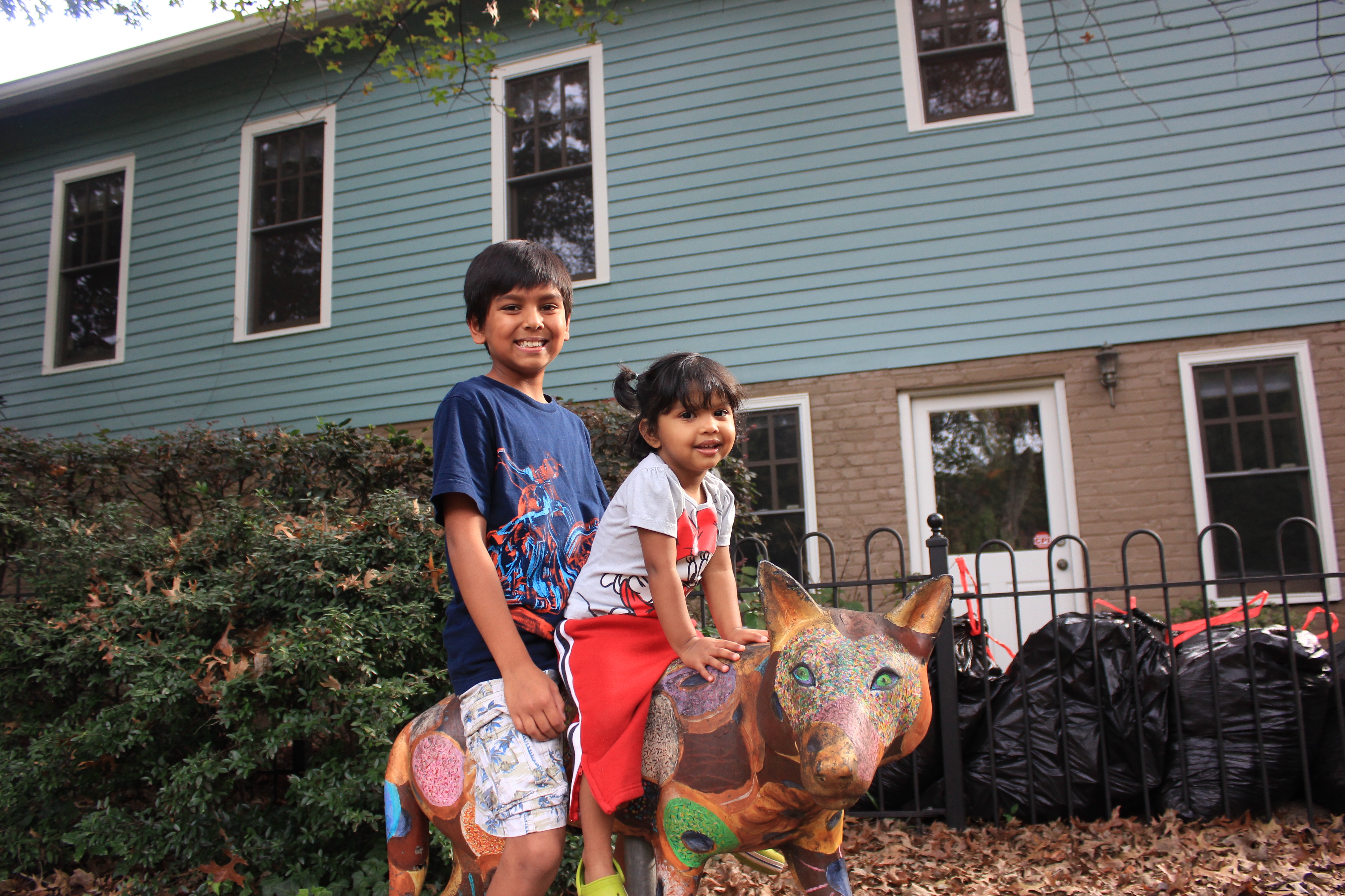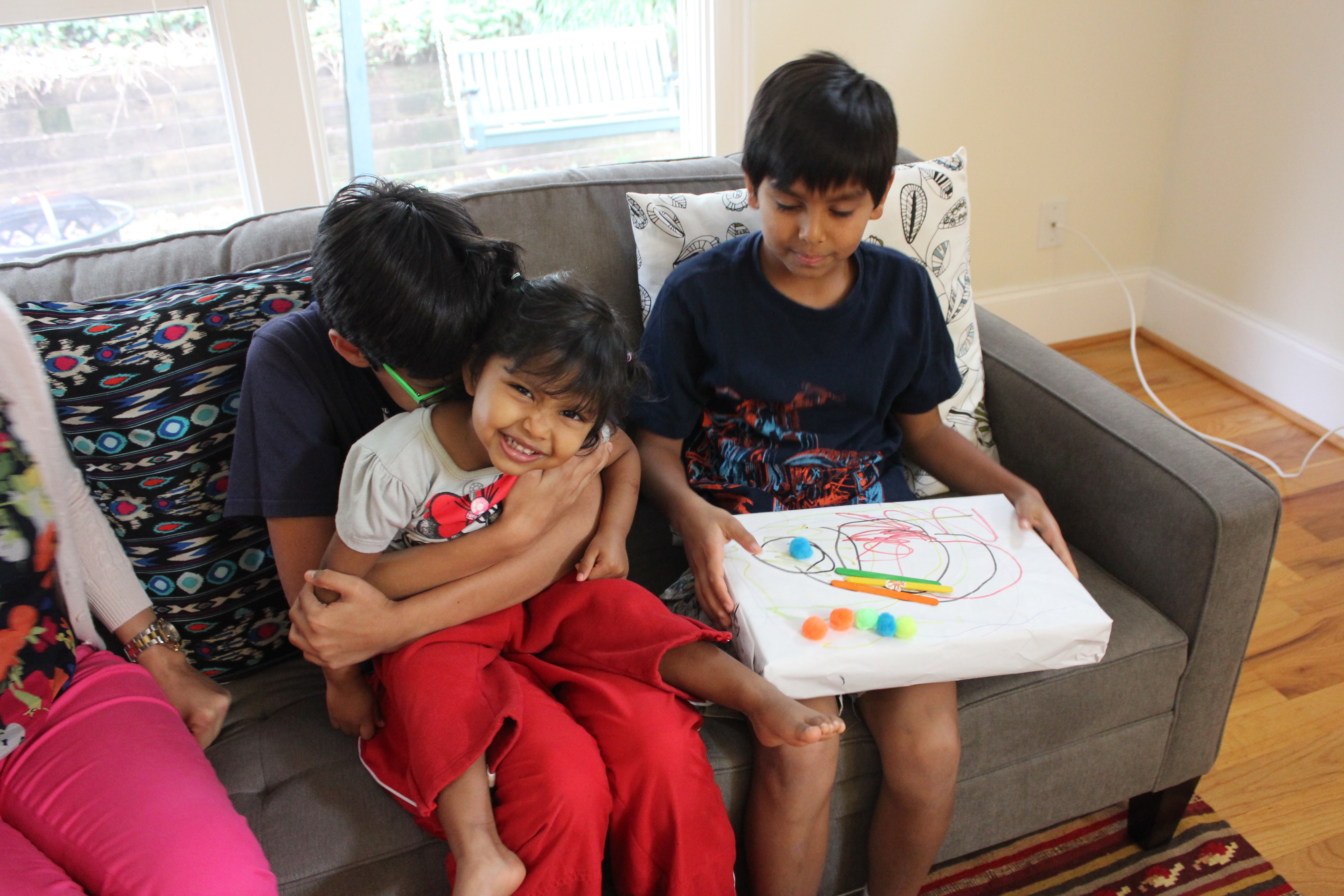 This weekend I unpacked a few cool weather clothes for Asha and noticed a pair of very cute red sweat pants. Turns out they were from a stash my sister had passed down to me and they originally belonged to my nephew Eshaan who is going to be 14 years old in a couple of months!! FOURTEEN! His brother Aashrai also got good use out of them and he will be 10 next month! I have a feeling that the pants will still be around for Arjun. Can I just say money well spent!? Coincidently my sister and the kids came by for a visit this weekend and I was able to get a few pictures to show off the pants and that…ah…how I’m aging so fast!!