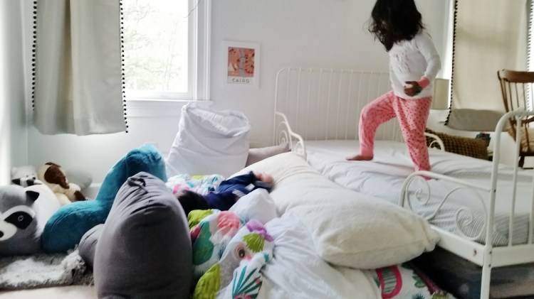 ***Lastly, I leave you with this bit where as a mother, I know I should immediately stop my kids from jumping on beds and on each other, but the kid in me sees how much fun they are having and I cross my fingers and pray that no one gets hurt. It’s basically a homemade bounce house where they make a pile of blankets and pillows and launch from the toddler bed. Inevitable the pile keeps getting thinner and still they don’t stop! Nerve-wrecking and exciting!