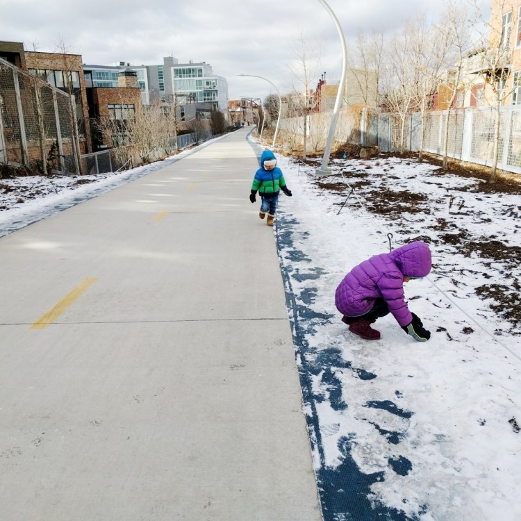 The Airbnb is in a new building that didn’t even exist when we lived across the street. Lucky for us the 2-bed-2-bath space was so big and so well furnished that it felt like a fancy hotel suit. Bonus of traveling to Chicago in winter is that we probably paid much less for what this place would have gone for in the summertime! The super best part however, was that it looked over the Western train stop. We were so close that I could have a staring match with people waiting on the platform, if only they knew that I was watching them (not creepy at all, right!). But the windows were surprisingly insulated and we weren’t bothered by the sound at all. The kids were glued to the floor-to-ceiling windows anytime we were inside, and yelled “trainnnnn” every 5 minutes. I think they were in transportation heaven. I thought it would get old after the first few minutes, but I was wrong!