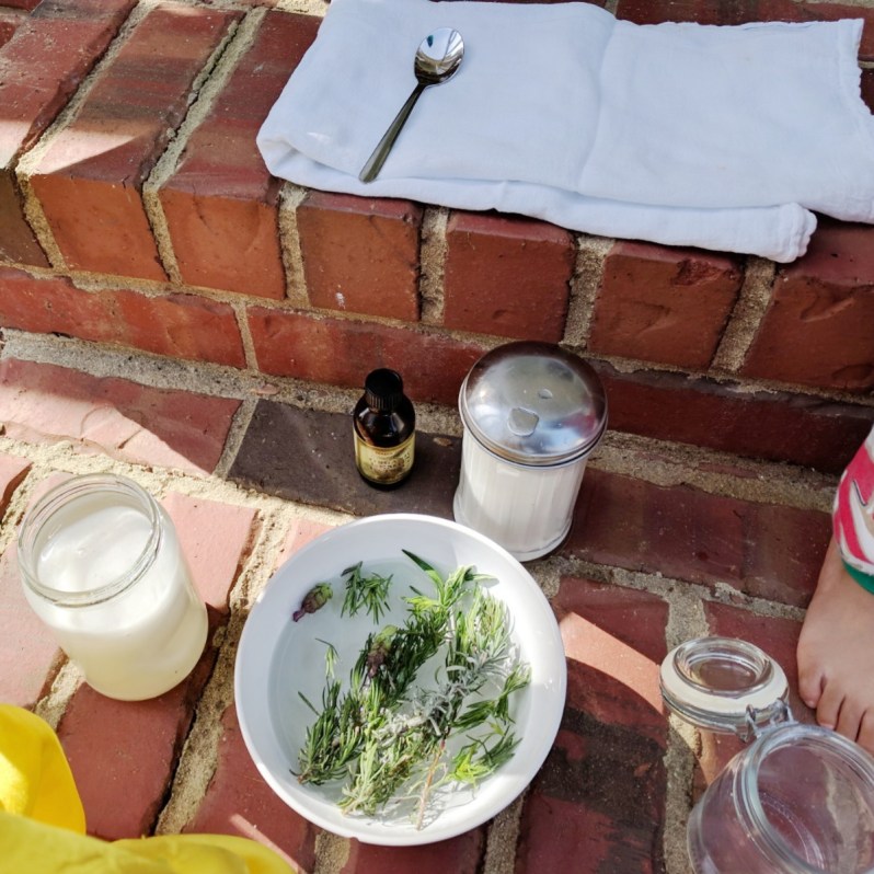 My facial skin is horribly sensitive. But this scrub made an excellent exfoliator and moisturizer before bed time. My hands, just get washed way too much and not lotioned enough, also loved the scrub. So, I got my troop together to help me harvest some more of the lavender and together we made a big jar of it for mama. Still, the jar lingers though. Looks like deodorant-making is in my future after all.
