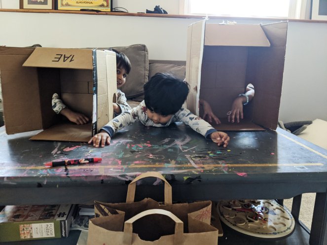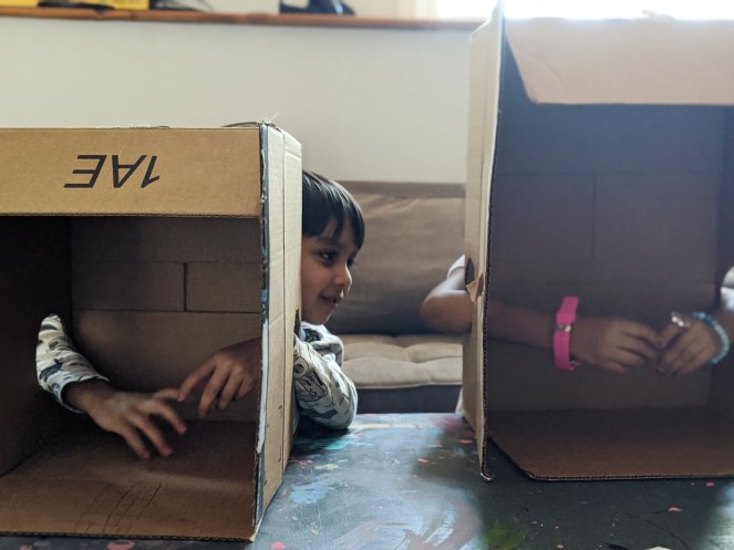 I had Asha and Arjun collect 20 things in secret from each other, and then used those items to feed the other’s guessing box. It was like I was giving away millions of dollars; the excitement was unreal. We ended up running around the house to find 50 more things. So just be warned to have a nice big stock pile of objects before you start for maximum fun!