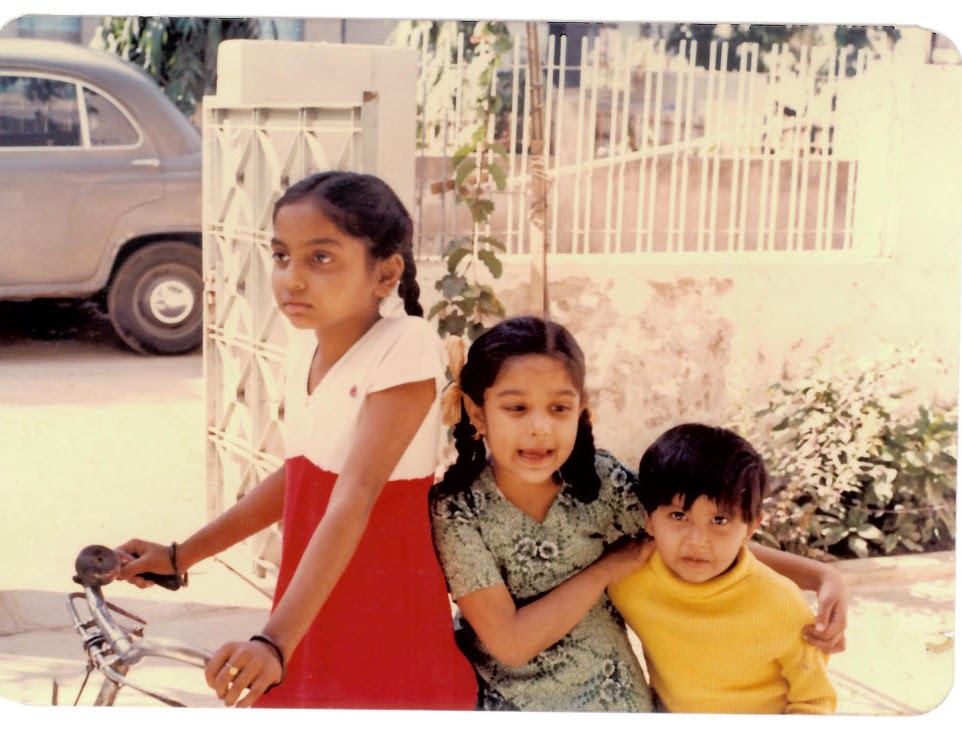 In the meantime, sharing this picture from circa 1987 if my memory serves me right. It’s a digital copy on my computer so I can’t easily flip it to see the exact year handwritten in blue ball point pen by my dad. My sister is at the head of the bike in the white and red dress. My cousin Veeral is in the middle. And I am in that yellow turtleneck sporting a “boy-cut”. According to my mom, detangling my sister’s hair and braiding them was such a daily chore that she decided to spare herself from doing it twice. As a result, my hair was always short growing up.