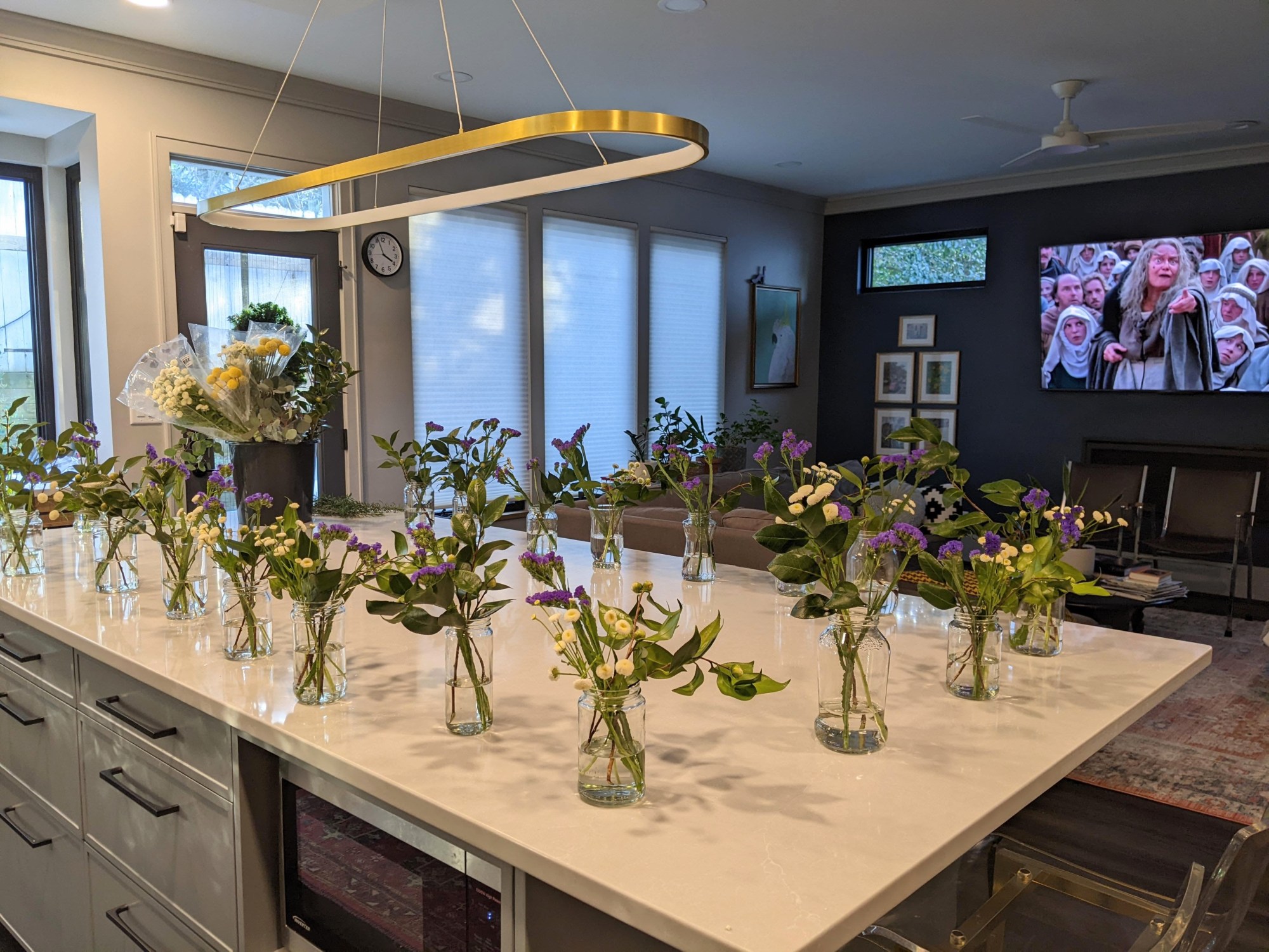 I made 20 in total over the course of an afternoon while watching The Princess Bride. Flowers came from Trader Joe’s and my yard. My least favorite part was scrubbing some of the old labels off the jars. My most favorite part was all the rest.