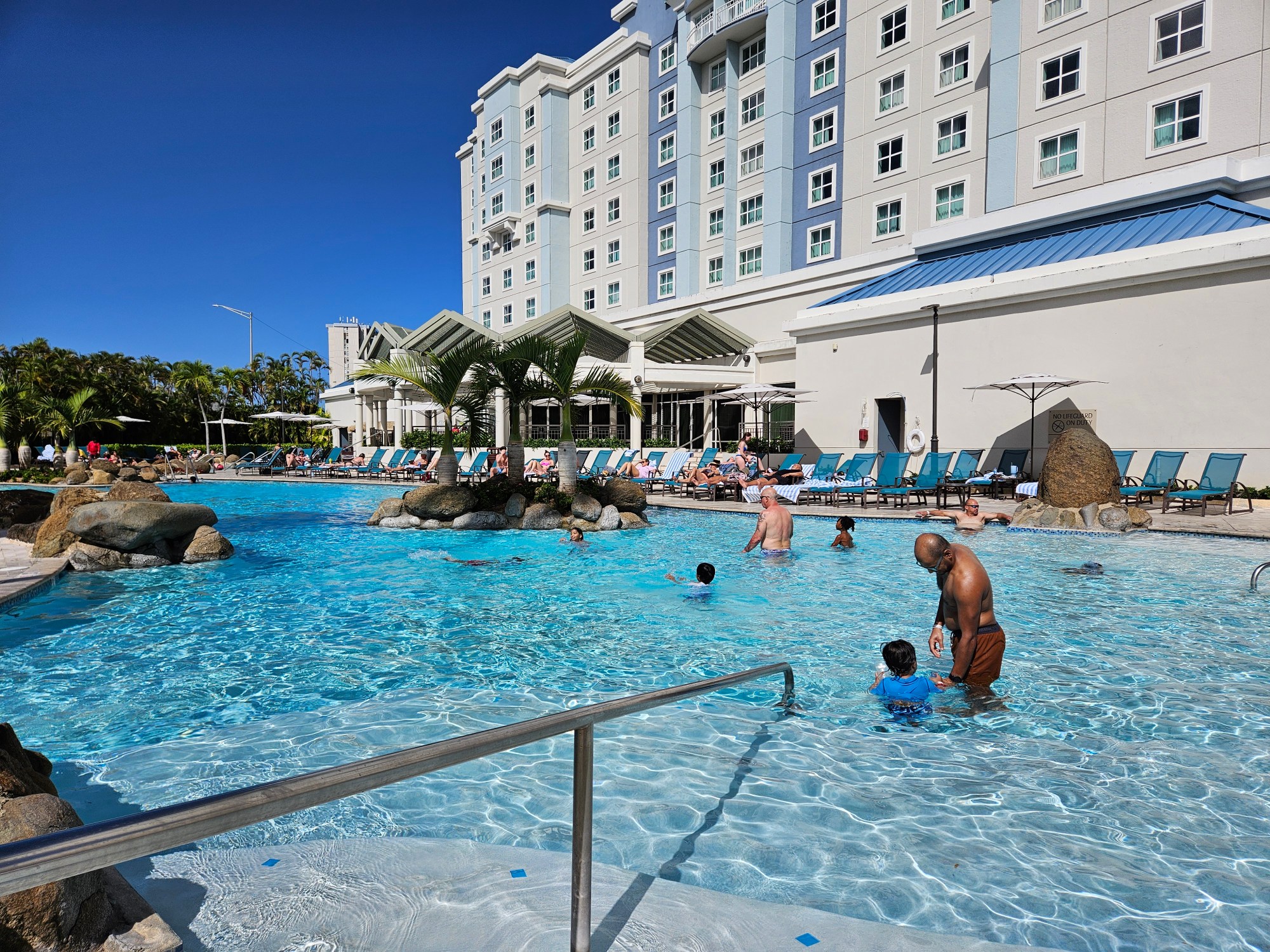The hotel pool is big and fun. The pool side restaurant great cocktails and food options. This particular Embassy Suites in San Juan is 2 blocks from the beach. It was a very easy walk which even the kids managed without complaining. Once at the beach, the hotel has umbrellas, chairs, staff, toys, and towels (in other words – nothing to carry). There are several restaurants around should lunch needed to be ordered. And plenty of beach vendors with coconut water and shaved ice.